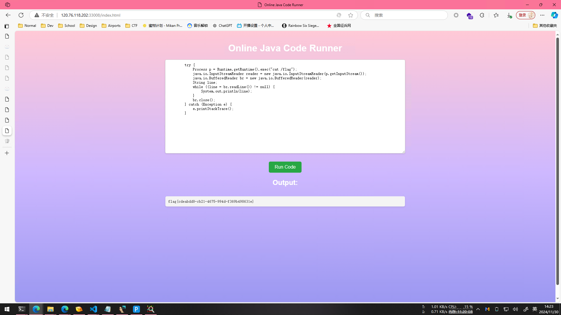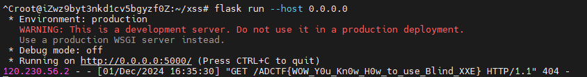 这里的https://org.bili33.top/CTFTMP/try.dtd是我借了Github服务器丢的一个文件(已删库,勿访问),这样能被访问到,然后我只需要读取/flag文件,所以在上面把file改成file:///flag,然后在我的公网服务器开一个flask服务器,等待回传就好了,得到flag为ADCTF{WOW_Y0u_Kn0w_H0w_to_use_Blind_XXE}