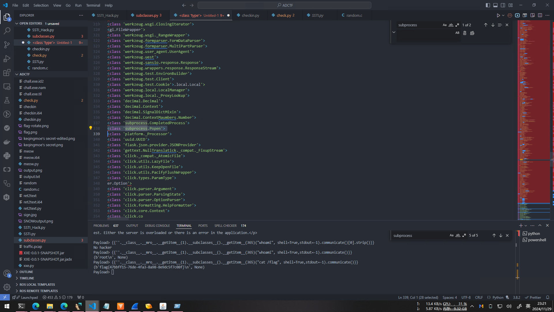 然后我用了点小技巧,把头尾的[]掐掉,然后把所有的, 替换为\n,就可以按照行号大概寻找到范围,然后搜索一下subprocess,找到行号为338,但是肯定不是338,因为这些数据并没有处理完全(例如图中348行就明显不对)