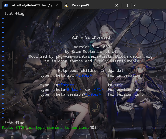 所以改成了:r !cat flag,:r可以把运行的结果保存在当前编辑器中,所以我就可以直接看到flag了