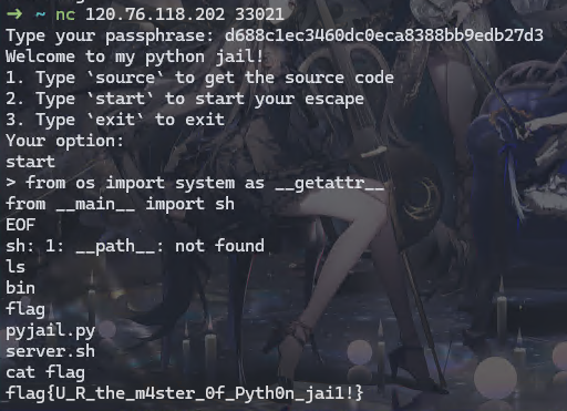 接着,从from __main__ import sh,我们正在运行的程序会被Python认为是__main__模块,而sh是这个模块里面不存在的一个属性,所以__getattr__会被调用,而我们的属性名为sh,所以本来是__getattr__("sh")会被拼接成system("sh"),达到了获得shell的目的