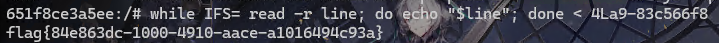 得到flag的文件名为4La9-83c566f8,还是因为没有libc,所以没有cat,所以用while+read