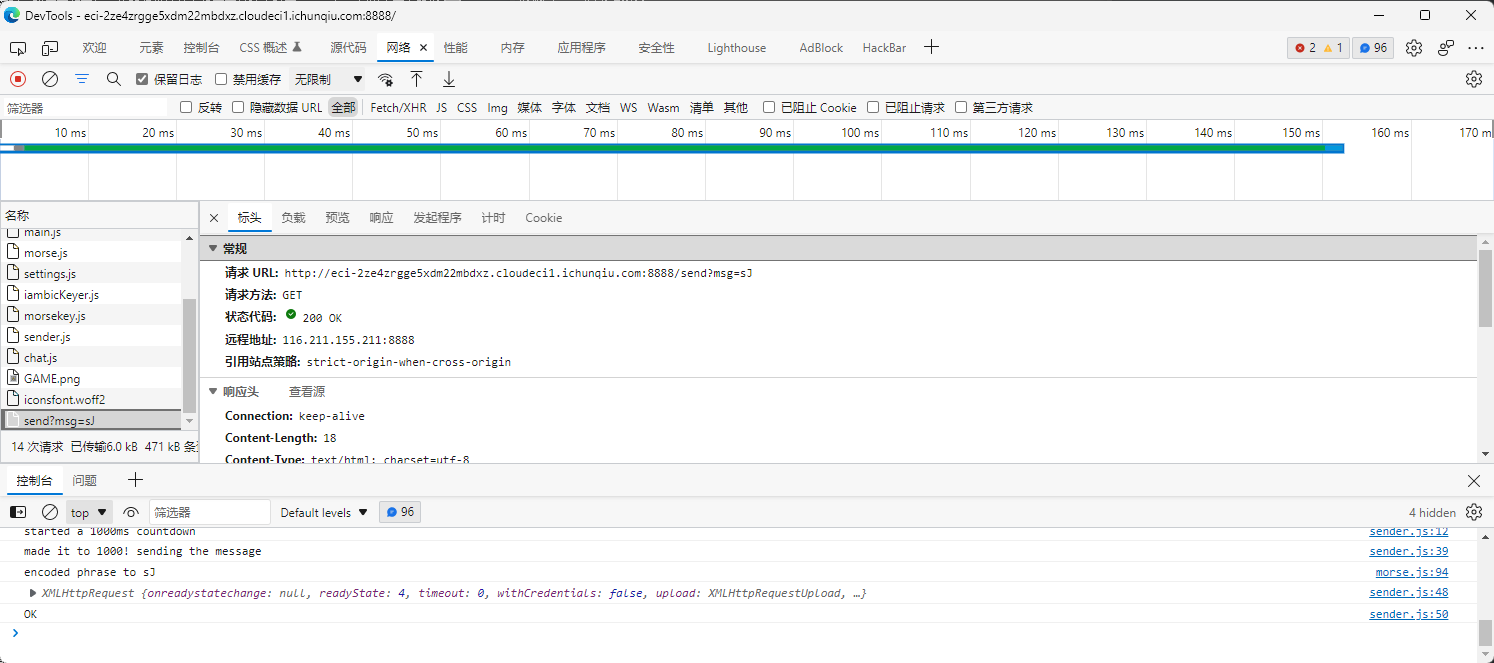 打开F12的开发者工具,然后按照要求点三下(即摩尔斯电码中的s),就抓到了请求的模板(这里手动的后面多了个J,但是实测不要J也可以)