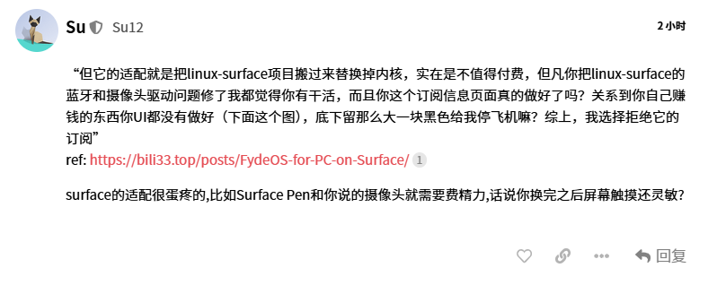其次,我上面说“它的适配就是把linux-surface项目搬过来替换掉内核”确实缺乏考证,就因为我看它跟linux-surface项目有同样的问题,我就如此断定,这点确实是我的不对,还请大家理性看待