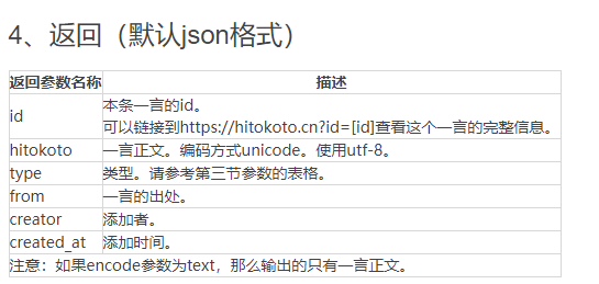 (12:00)开始做爬虫了,先到一言去看看API是怎么用的先。在官网,可以看到下面这个表格(为了方便,我直接把源码拿过来了)