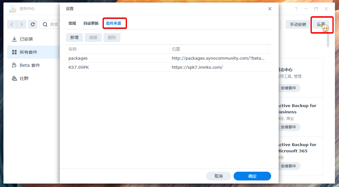 点开套件中心,点击设置,然后添加自己的套件源就行了