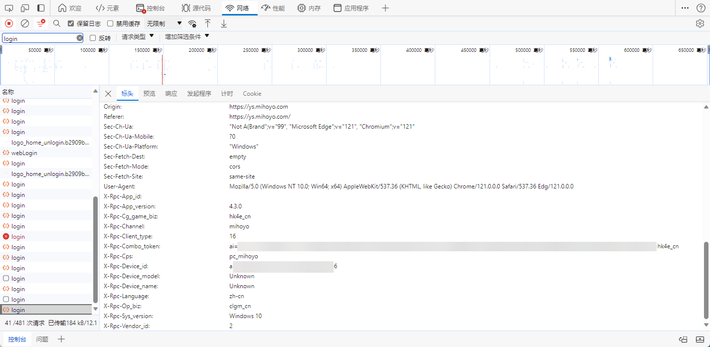 开发者控制台会弹出很多的请求,在左上角的搜索框里面搜索login,点击最下面的一个条目