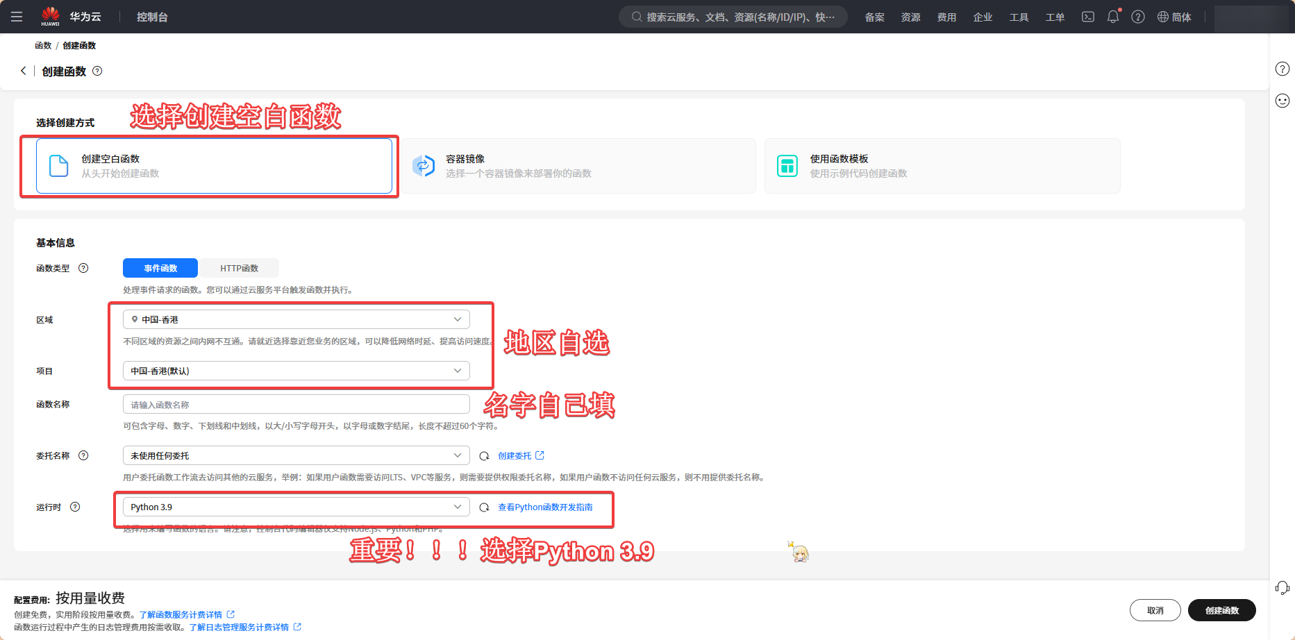 我们首先需要去华为云注册一个号,然后打开函数工作流面板,点击创建函数,地区根据自己需要选,推荐直接选香港
