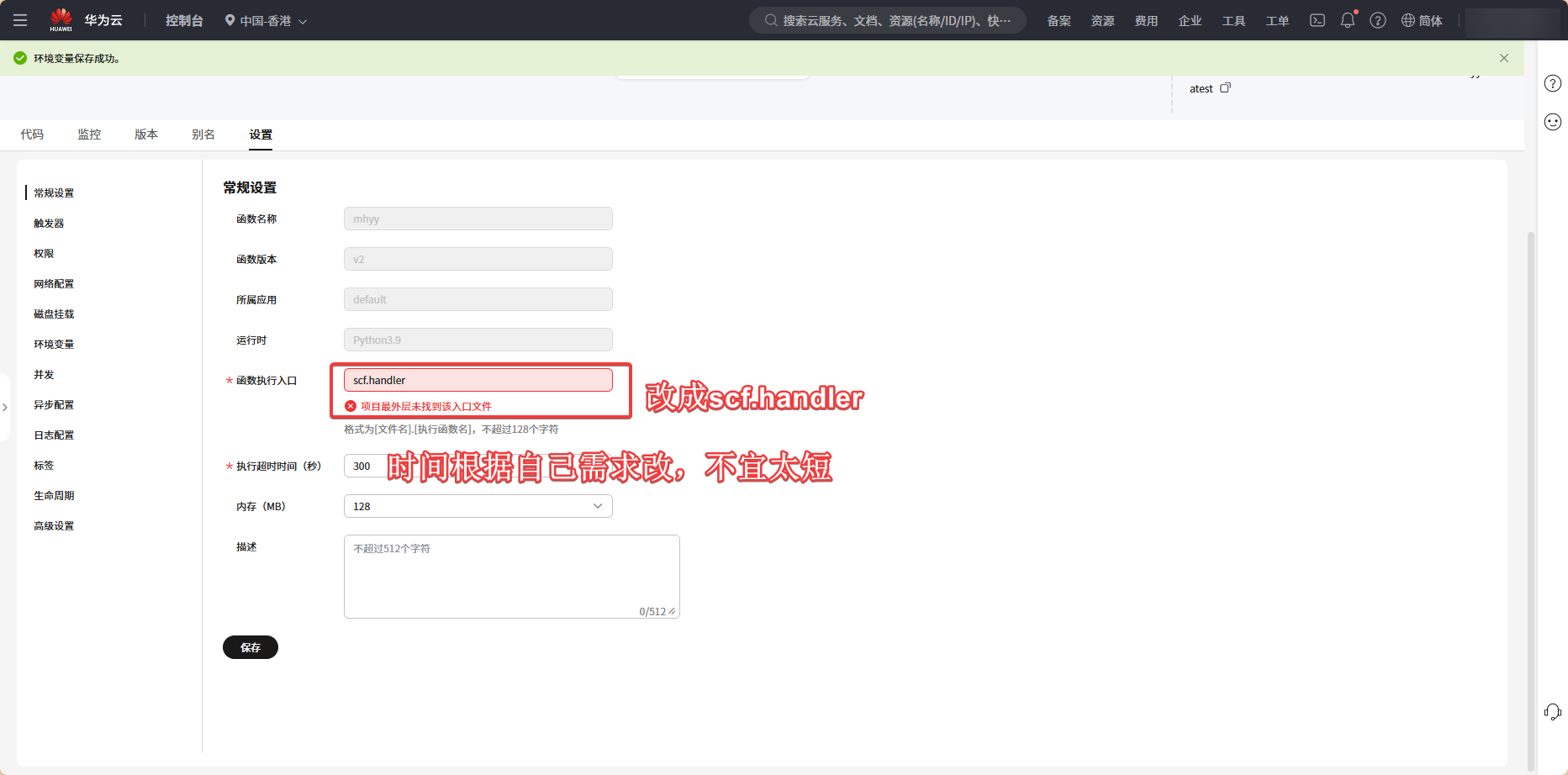 接着往下拉,在基本信息里面,我们点击编辑,然后把函数执行入口改成scf.handler,时间根据自己需要改