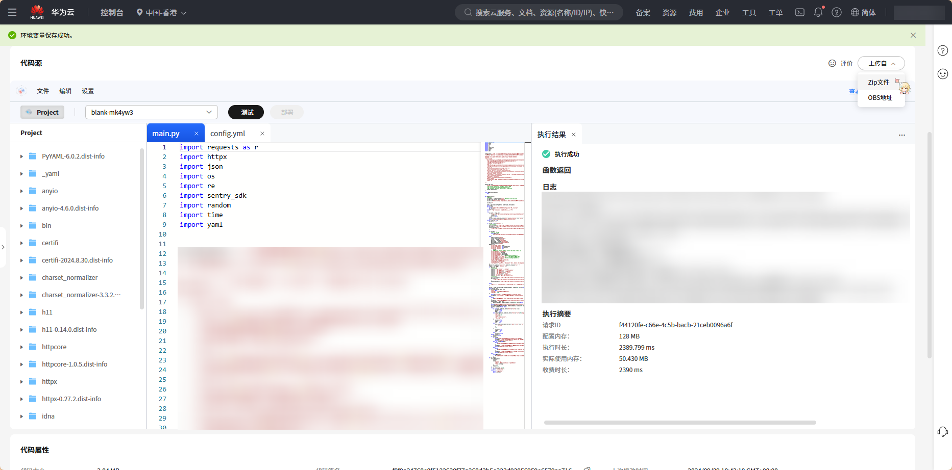 然后把当前文件夹打包(包括安装依赖时产生的一堆文件夹),在函数页面选择上传自,再选ZIP文件