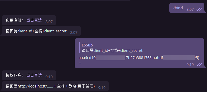 然后我们回到Telegram,输入刚刚的UUID和Secret秘钥,需要按照提供的格式进行输入