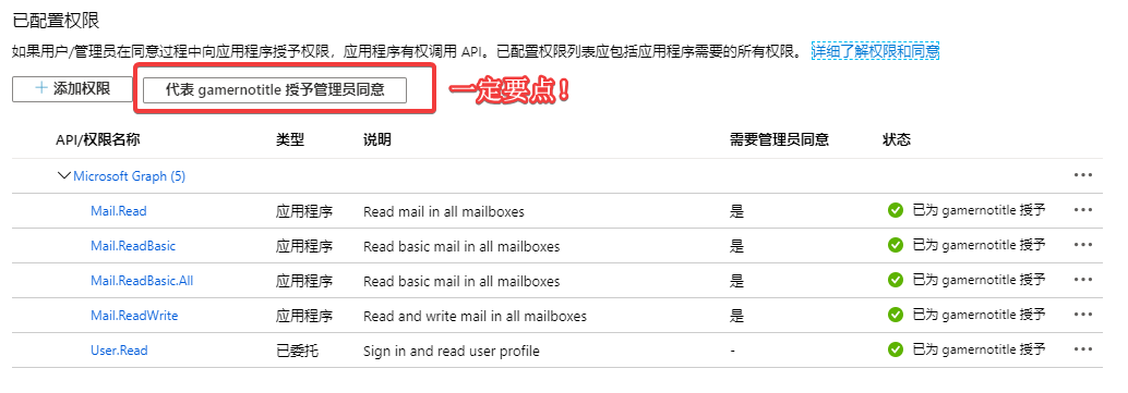 接着点到API权限,点击添加权限,选择Microsoft Graph,然后选择右边的应用程序权限,勾选Mail.Read、Mail.ReadBasic、Mail.ReadBasic.All、Mail.ReadWrite即可,剩下那个Mail.Send不用选择,勾选后确定,点击添加权限右边的代表xxx授予管理员同意,一定要点,否则无法正常运行