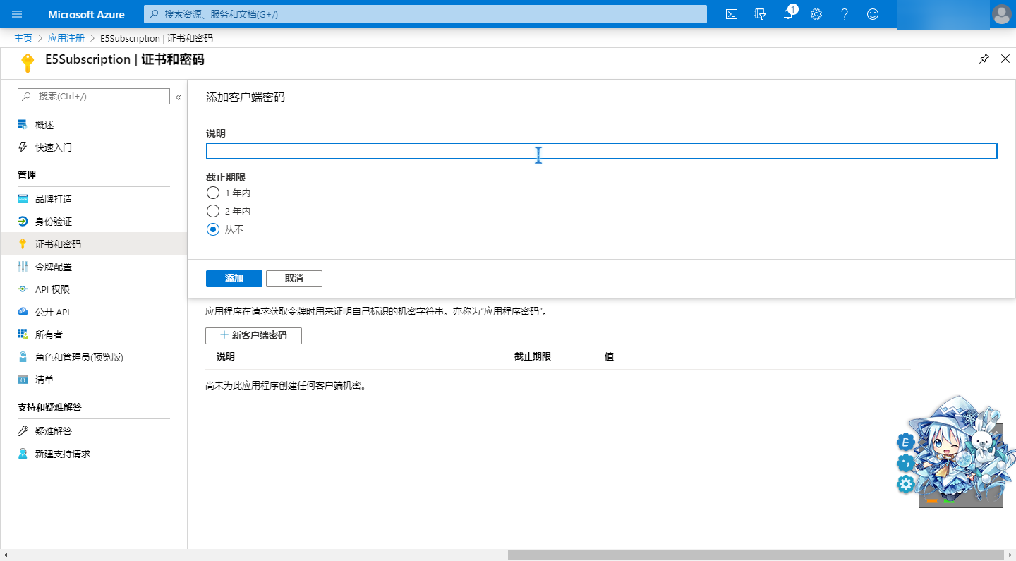 进入页面后,我们复制上面显示的应用程序(客户端)ID,以供备用,接着我们点击左边的证书和密码,创建我们这个程序的密码