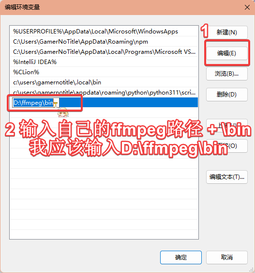 在弹出来的窗口,我们点击新建,然后输入自己的ffmpeg路径+\bin(一定要加\bin,否则输入ffmpeg会打开这个文件夹),然后选择确定,这个时候ffmpeg就安装好了