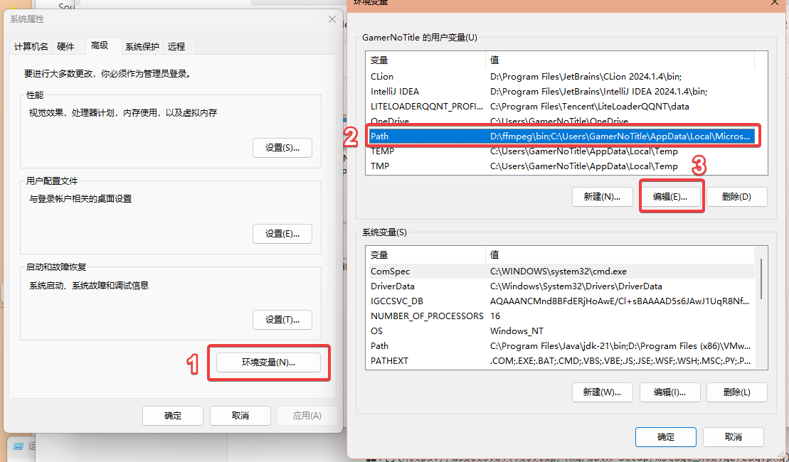 点击环境变量,选择上面框框内的Path,然后点击编辑