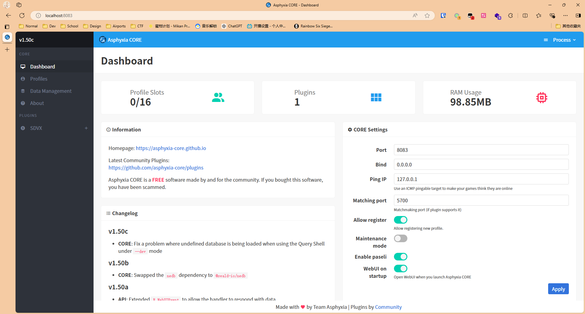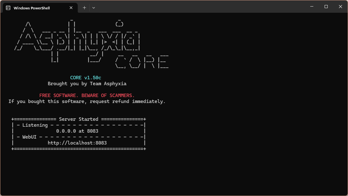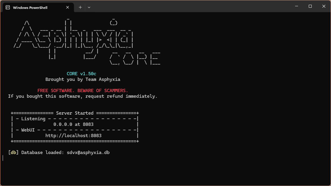 解压完后,我们直接双击打开asphyxia,它会弹出一个控制台窗口,我们不管这个窗口(不要关掉它),直接浏览器访问http://localhost:8083
