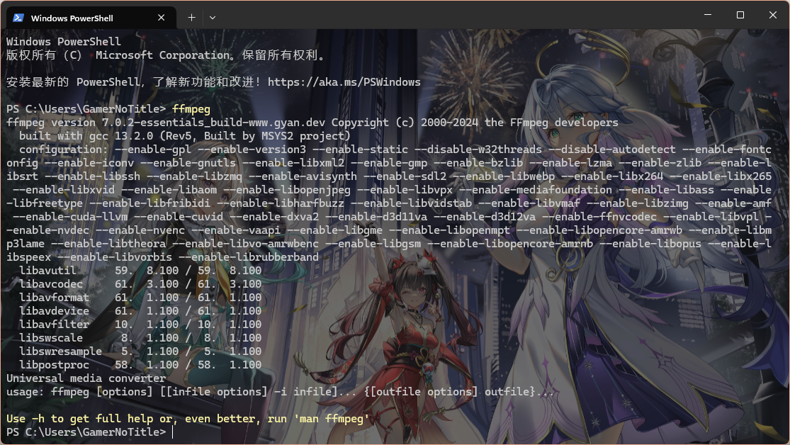 然后,我们打开一个控制台,输入ffmpeg确认ffmpeg的安装,如果你跟我一样有弹出,说明已经安装好了