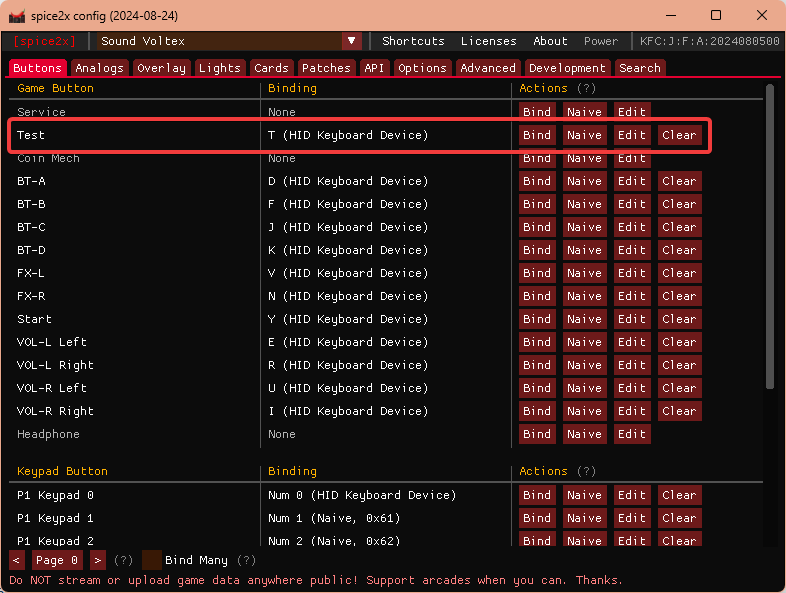只需要绑定我下图中我绑定了的键就可以了,Test键是第一次运行游戏需要的,配置完后可以去掉绑定