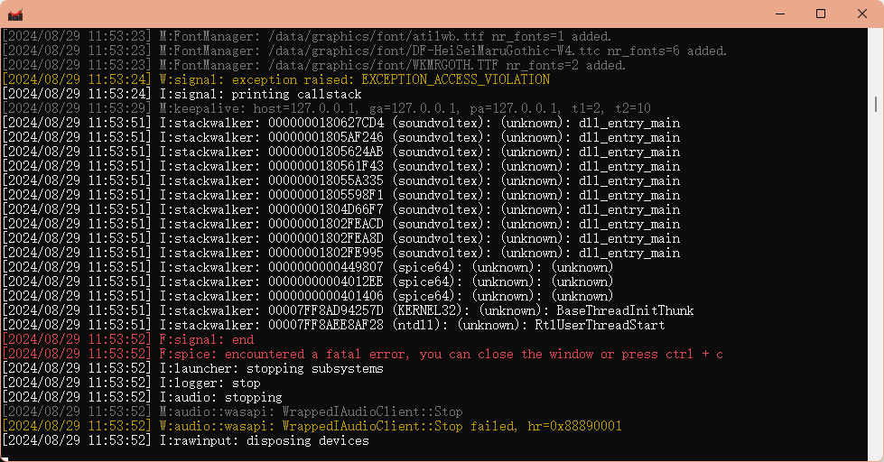 为什么我的SDVX卡住了打不开,并且控制台提示exception raised: EXCEPTION_ACCESS_VIOLATION?