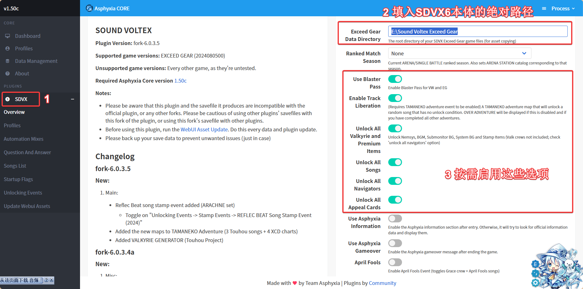 我们点击左边Plugins分栏下面的SDVX,然后在左边的Exceed Gear Data Directory里面填入自己游戏的绝对路径
