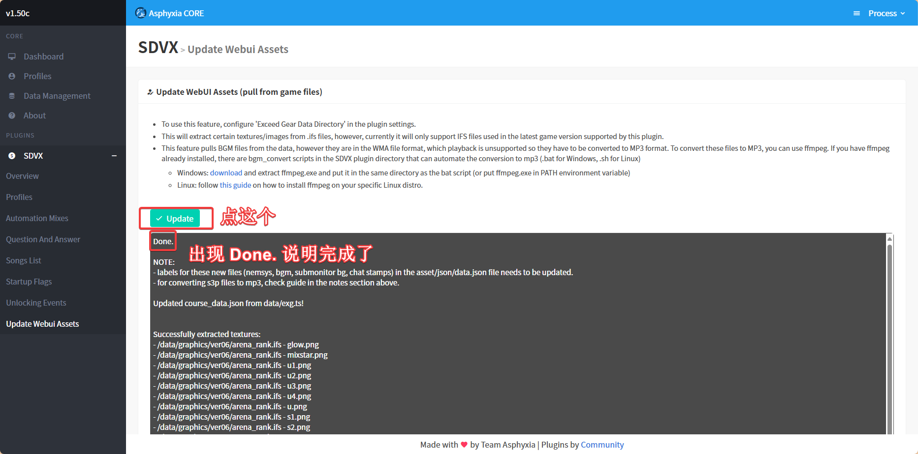 接着我们访问http://localhost:8083/plugin/sdvx@asphyxia/update%20webui%20assets这个链接,进行资源的初始化更新,直接点击Update按钮即可