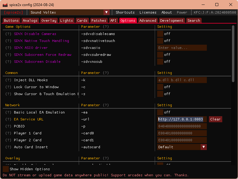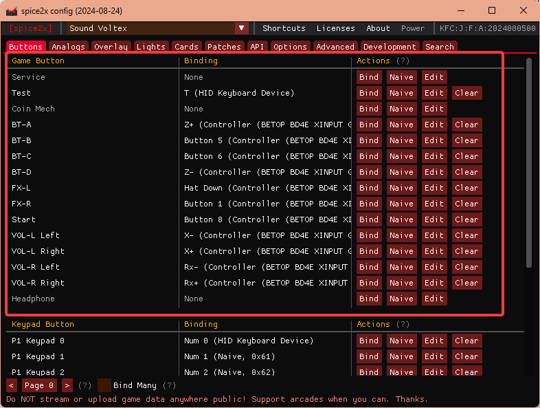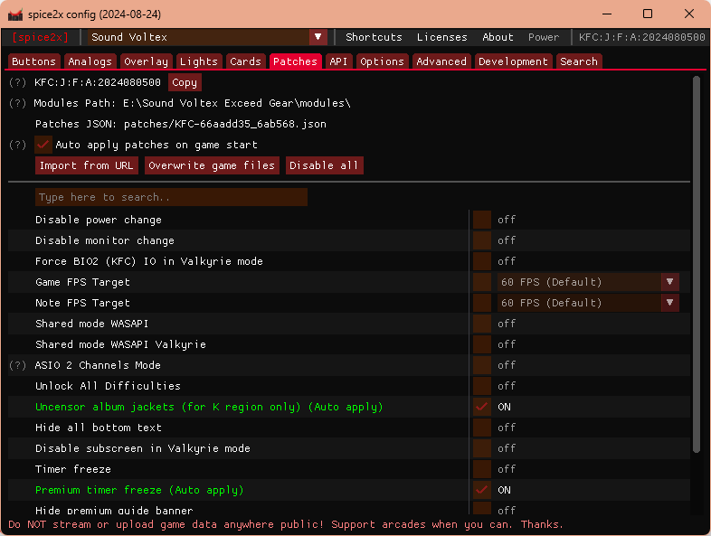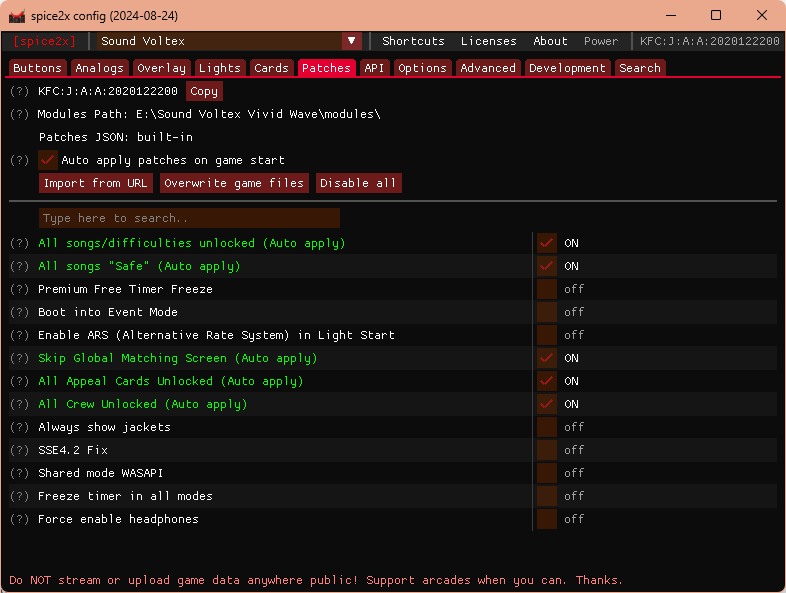 请注意:spicecfg.exe里面的配置是跟随机器的,也就是说,如果你的电脑同时拥有Sound Voltex Exceed Gear和Sound Voltex Vivid Wave,这个配置会同时应用到两个游戏,这种情况下,推荐在启动脚本里面用启动项的方式分别配置两个游戏