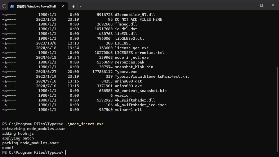 更新了怎么办?这个简单,你把Typora目录下的node文件夹删掉,这个文件夹是asar反编译时产生的,删掉了不会对Typora产生任何影响,然后重新跑一次上面这个过程就行了
