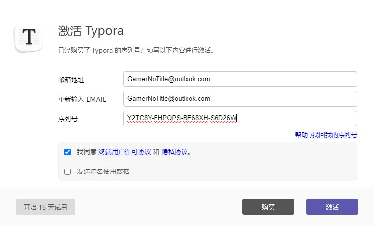 我们再打开Typora,进行激活过程,激活码填程序给我们生成的这个,邮箱可以随便填