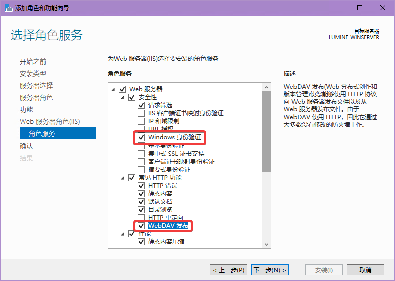 再在下面Web 服务器角色(IIS)选项卡下的角色服务添加Windows 身份验证和WebDAV 发布