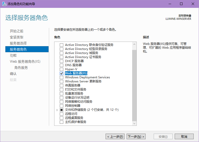 首先先打开Windows Server自带的服务器管理器,选择添加角色和功能,在服务器角色选项卡添加web 服务器(IIS)