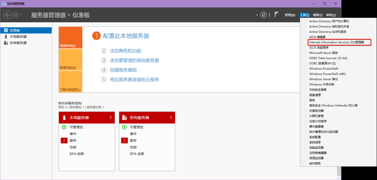 重启完了以后,我们还是打开服务器管理器,在右上角的工具里面找到IIS工具