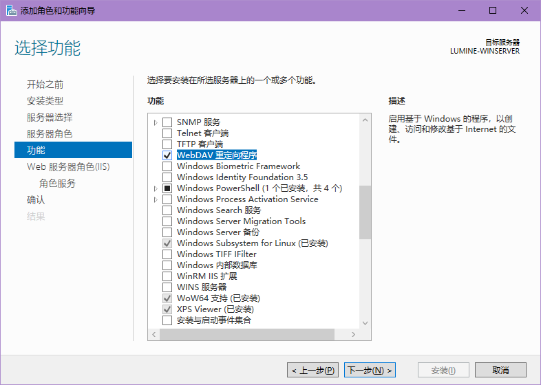 然后跳到功能选项卡,勾选Webdav重定向服务