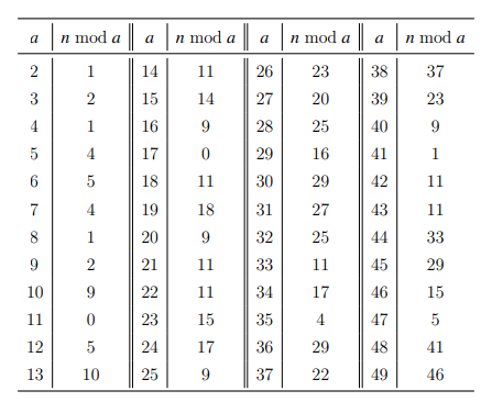 【问题描述】 有一个不超过 1017 的正整数 n,知道这个数除以 2 至 49 后的余数如下表 所示,求这个正整数最小是多少。
