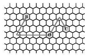 偏南 60◦。对于给定的一点 O,我们以 O 为原点定义坐标系,如果一个点 A 由 O 点先向 d 方向走 p 步再向 (d + 2) mod 6 方向(d 的顺时针 120◦ 方向)走 q 步到达,则这个点的坐标定义为 (d, p, q)。在蜂窝中,一个点的坐标可能有多种。下图给出了点 B(0, 5, 3) 和点 C(2, 3, 2) 的示意。